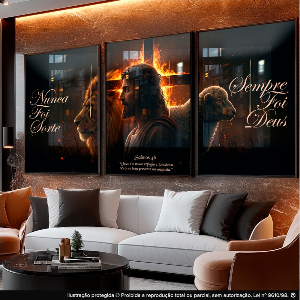 Esses quadros combinam arte religiosa com frases inspiradoras dos salmos. O leão simboliza a força de Cristo, enquanto a ovelha representa a fé e a proteção divina. A imagem de Jesus traz um toque de serenidade e devoção para o ambiente.